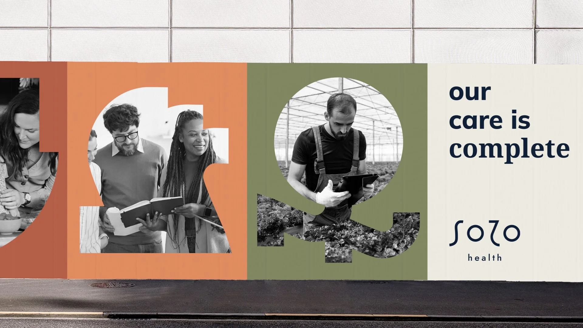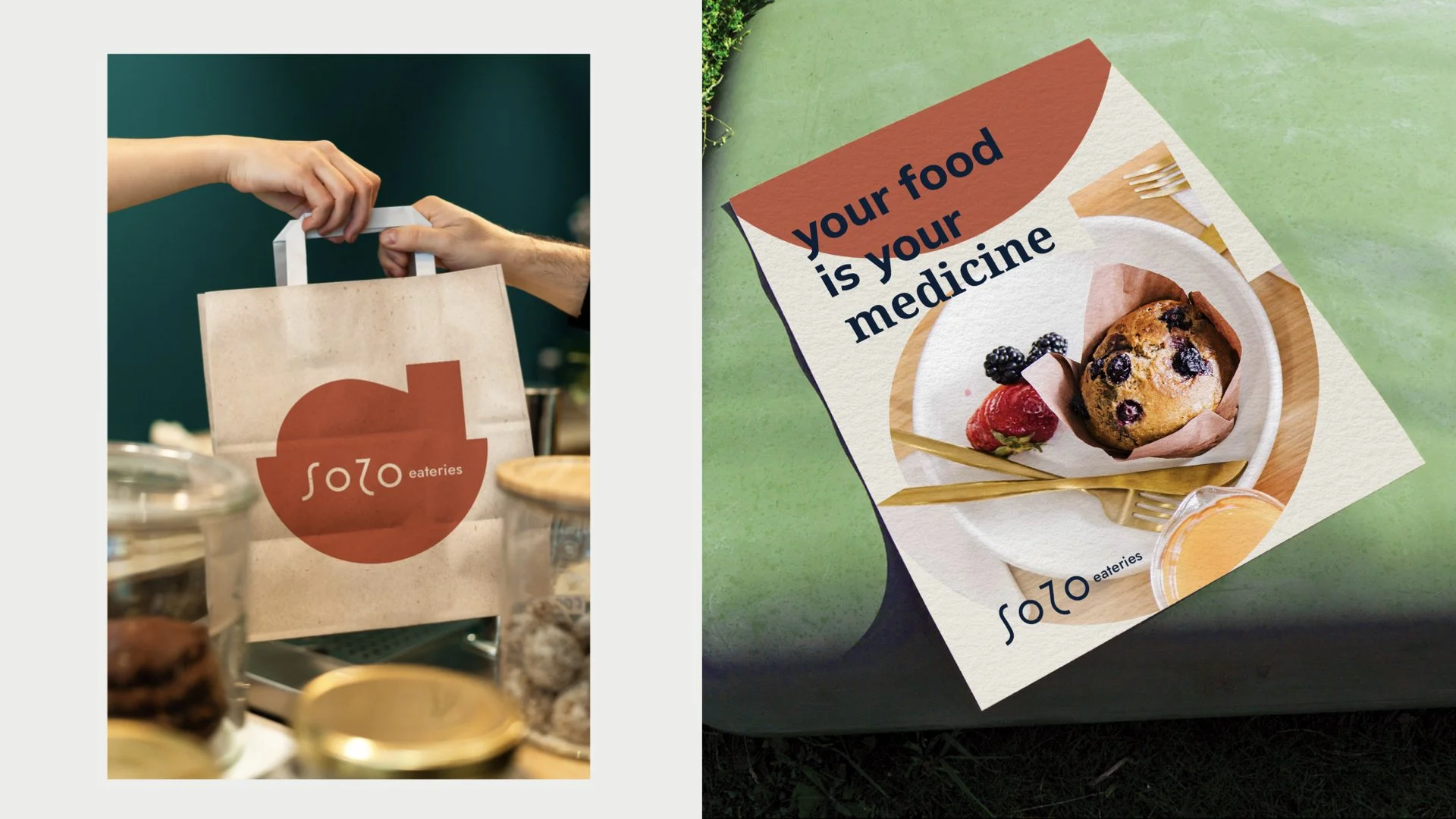 Sozo é uma palavra grega que traz a completude como alvo de vida. Pensando na nossa marca e no que desejamos construir com as pessoas, criamos uma identidade visual que representa cada significado literal da palavra: salvar, curar e libertar. Cada produto da Sozo reflete um aspecto importante para a nossa saúde. Em cada área da nossa arquitetura, um símbolo que fortalece essa ideia, com as mesmas linhas, que mudam de lugar, e claro, que também fazem parte de um mesmo sistema de cores, representando a vida, a diversidade dos alimentos, e ao mesmo tempo, a ligação com o que é natural, da nossa terra.